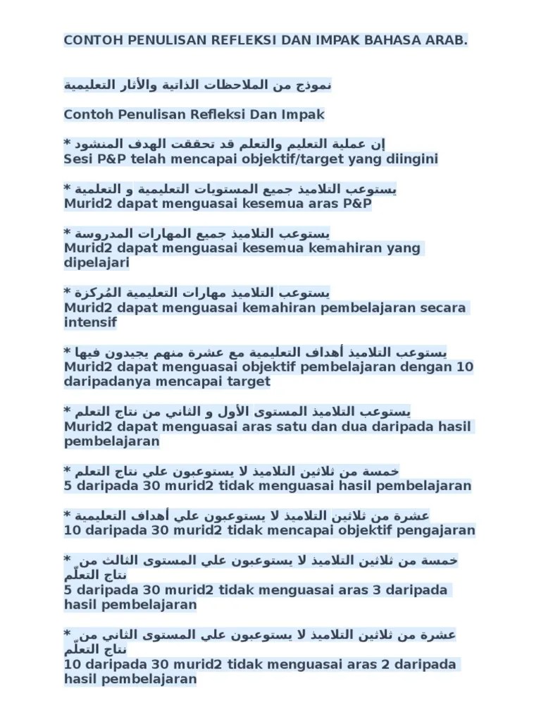 Text of contoh penulisan refleksi dan impak bahasa arab.